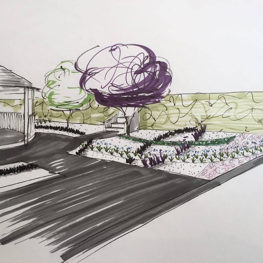I produced several layouts for Jane to look at & took the opportunity to extend the bed at the same time. In addition to this area being a social hub, it is also a transitional spot leading to the cutting garden. It was essential therefore that it looked excellent year round. I thought it could appear as a stylised painting reminiscent of Piet Mondrian whom I’d studied & admired at Art College many years ago.