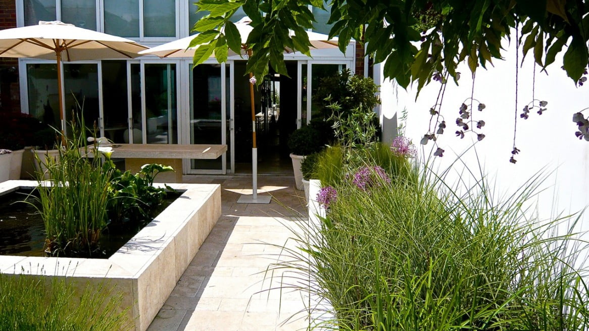 A modern minimal walled courtyard garden in Henley on Thames featuring raised beds, a raised pond & a water wall with beautiful ornamental grasses & mediterranean planting