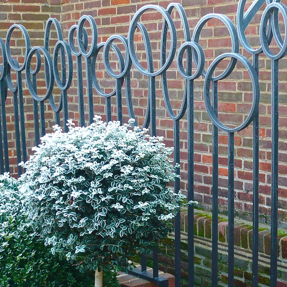 A lovely new job for me! to design railings to tie in with the pompoms & secure the newly found room. I came up with two ideas & this is the one we went with – straight rails similar to those in smart London squares but topped with beautiful ellipses. Michael Jacques, master blacksmith came to see us & discussed the project. He thought overlapping the ellipses/hoops would make a stronger bond so we agreed & off he went to make samples.